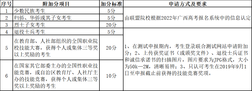说明:①表中附加分项目及加分标准仅适用于本次联盟院校的高职对口中职自主招生联合测试;②同一考生符合多项加分条件的,只按其中最高一项加分分值计入总分。