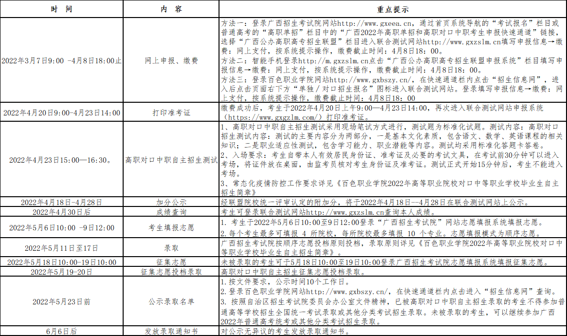 【结尾】以上是“2022年百色职业学院对口中职自主招生简章”的相关内容,若想获取百色职业学院对口中职自主招生历年真题、考试大纲等更多信息,请关注广西对口单招网(http://www.gxgzgz.cn)。